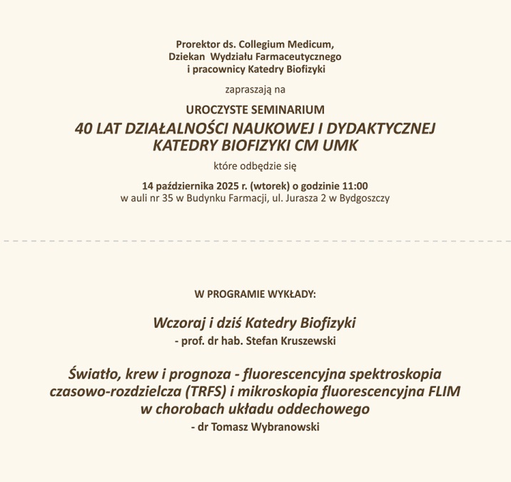 Z przyjemnością zapraszamy Państwa do udziału w seminarium „40 LAT DZIAŁALNOŚCI KATEDRY BIOFIZYKI”, które odbędzie się we wtorek 14 października 2025 r. o godzinie 11:00 w auli 35 w Budynku Farmacji.