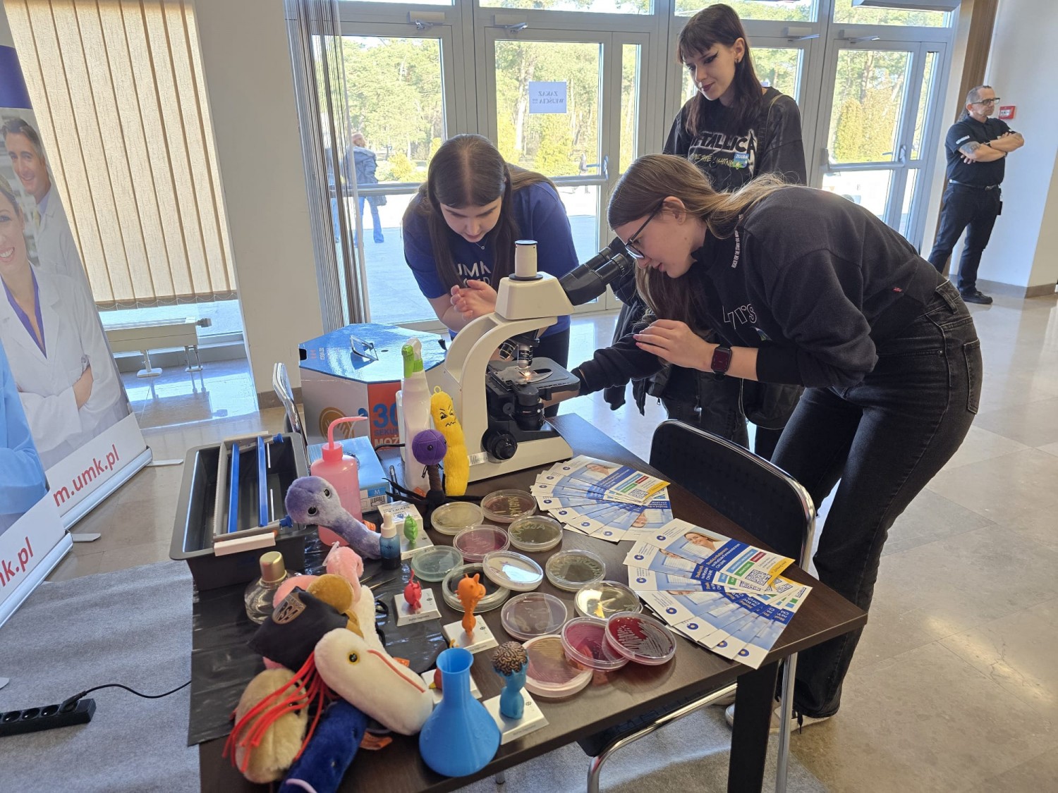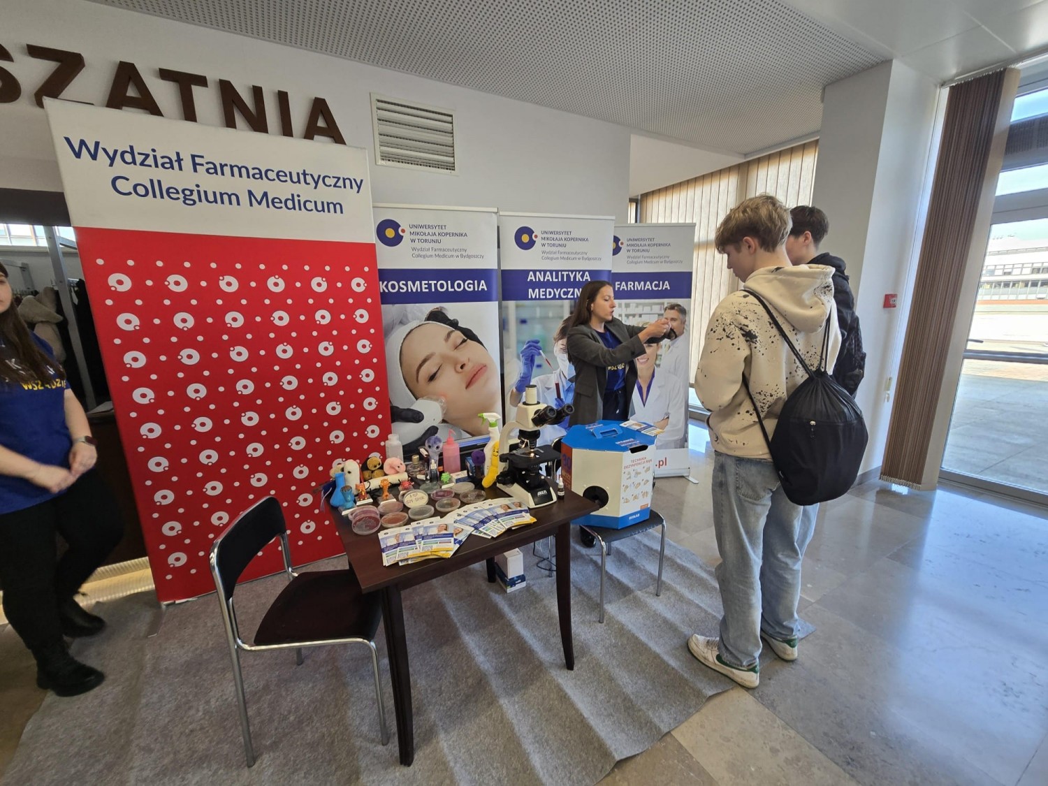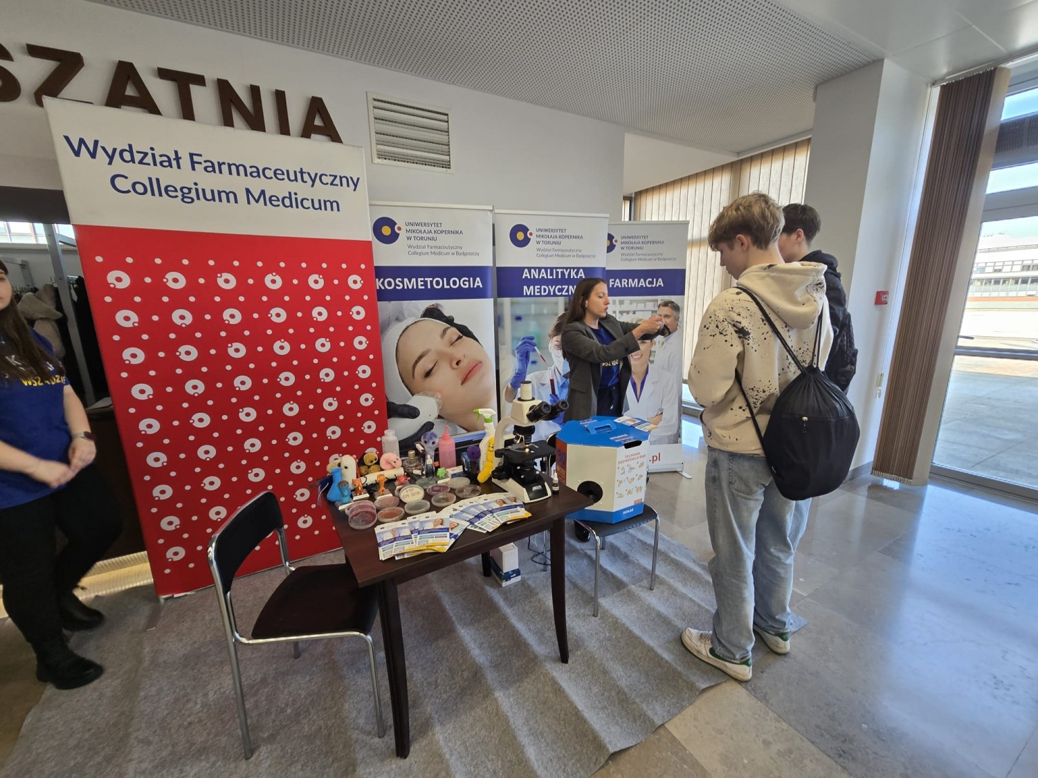 Wśród wystawców obecny był również Wydział Farmaceutyczny Collegium Medicum UMK, reprezentowalny przez: dr. hab. inż. Krzysztofa Skowrona, prof. UMK, dr. n. med. Katarzynę Grudlewską-Budę oraz mgr. Julię Czubę z Katedry Mikrobiologii. W organizację i przygotowanie stoiska aktywnie włączyli się także doktoranci i studenci: mgr Kamil Szupryczyński (doktorant), Natalia Rojek (Kosmetologiczna Organizacja Studencka) oraz Katarzyna Siemiątkowska-Grzybowska (Studenckie Towarzystwo Diagnostów Laboratoryjnych).