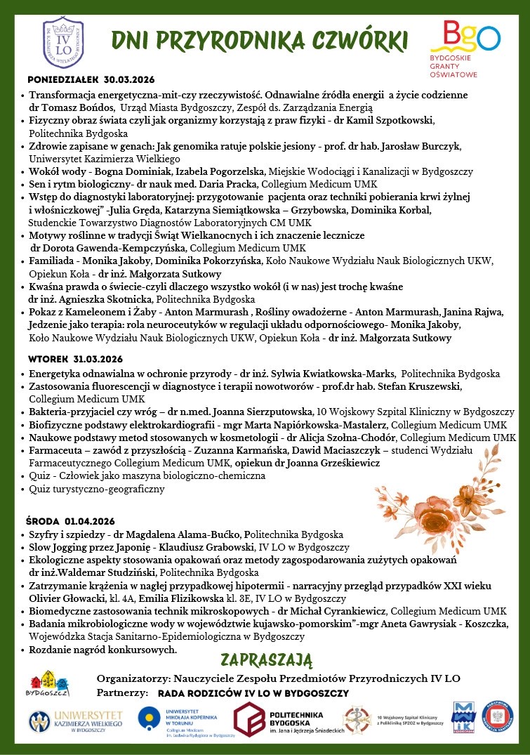 W dniach 20.03. 31.03 oraz 1.04. pracownicy Katedry Biofizyki przeprowadzili zajęcia dla uczniów IV Liceum Ogólnokształcącego w Bydgoszczy. Zajęcia m.in. były realizowane w ramach Dni Przyrodnika Czwórki (30. 0.3 - 1. 04.), a poprowadzili je: