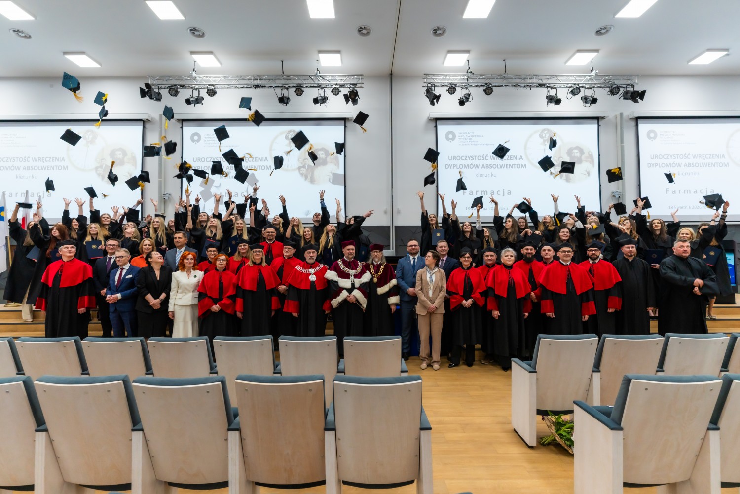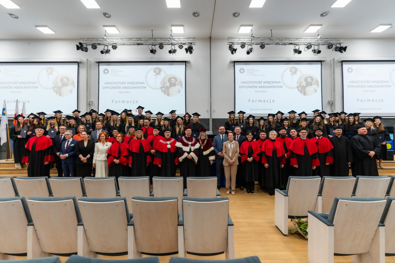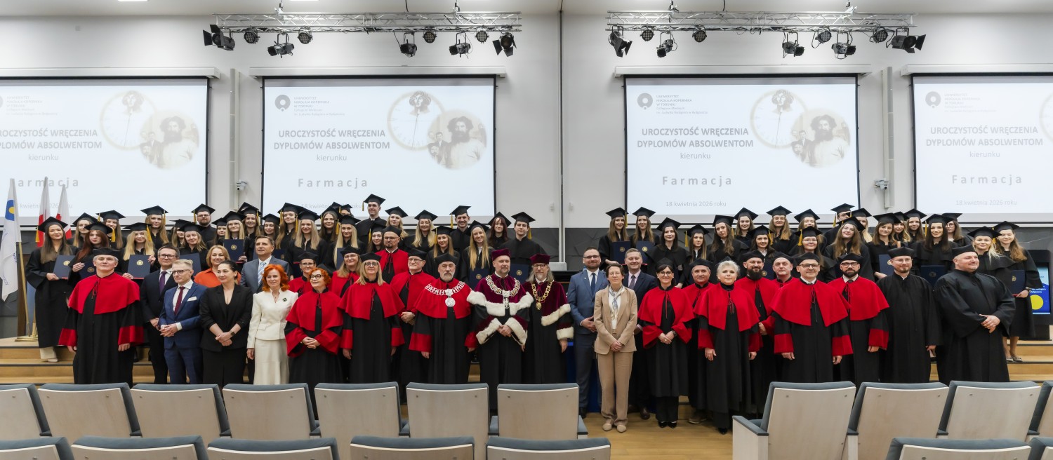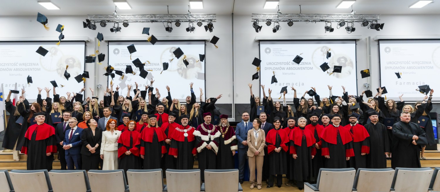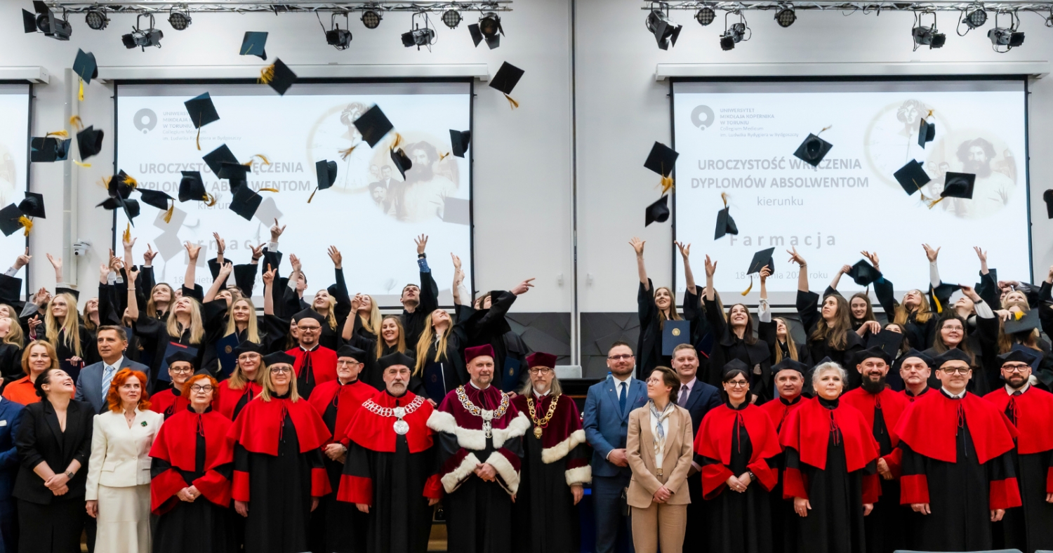 18 kwietnia 2026 r. na Wydziale Farmaceutycznym Collegium Medicum UMK odbyło się dyplomatorium kierunku farmacja. Podczas uroczystości 63 absolwentów odebrało dyplomy magistra farmacji.
