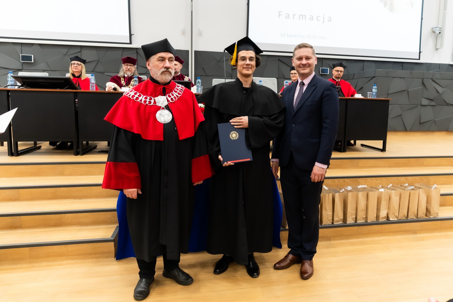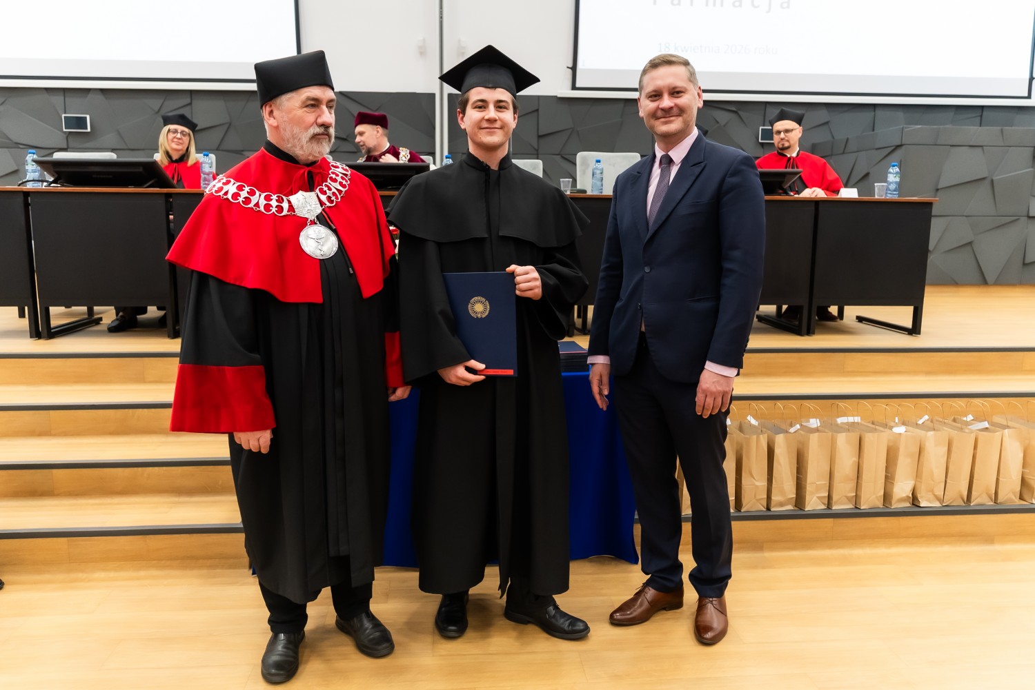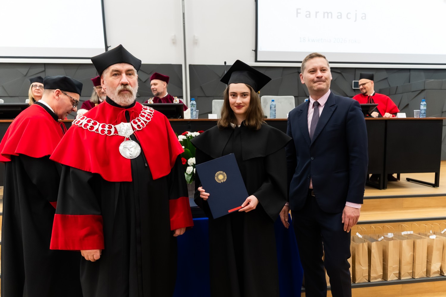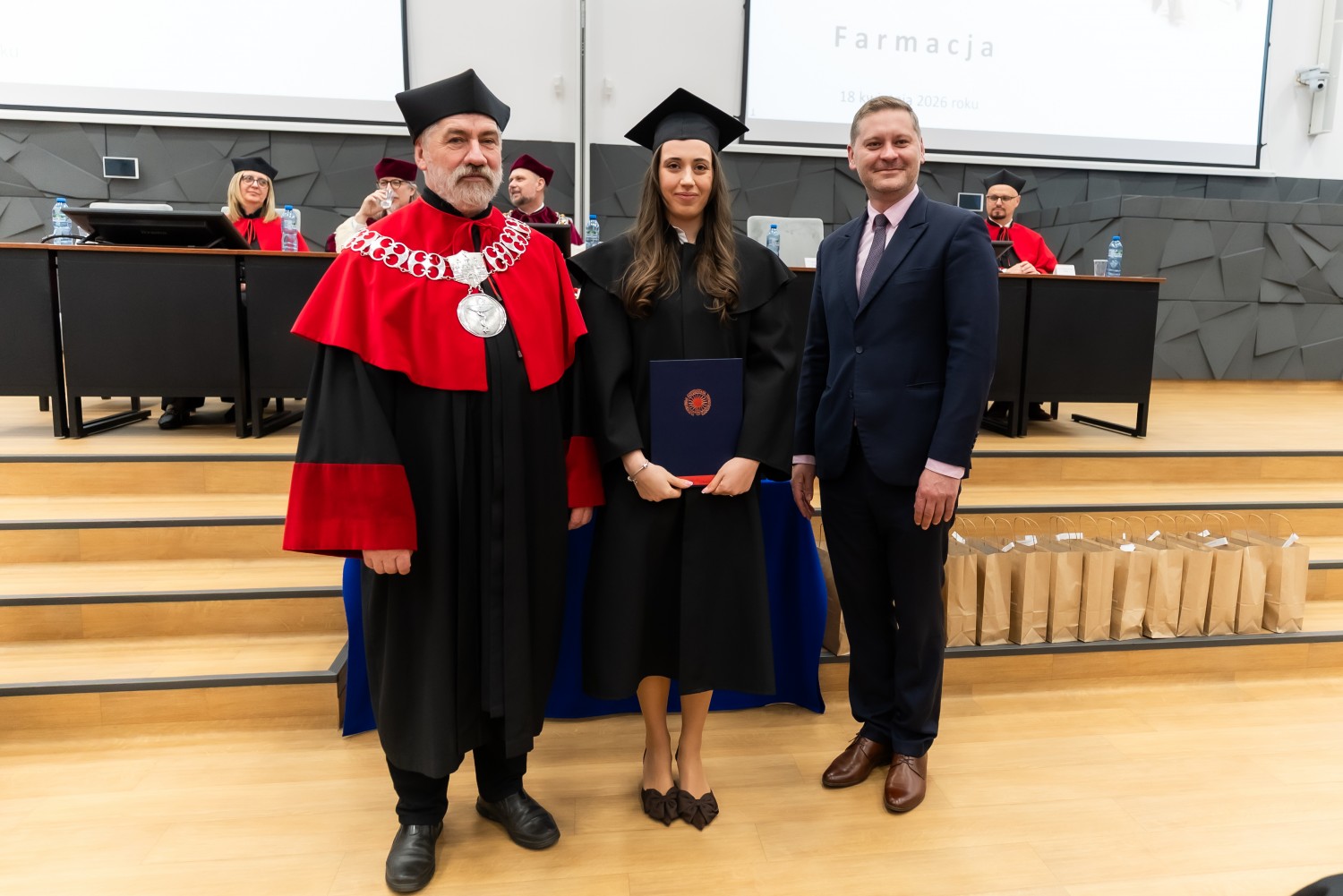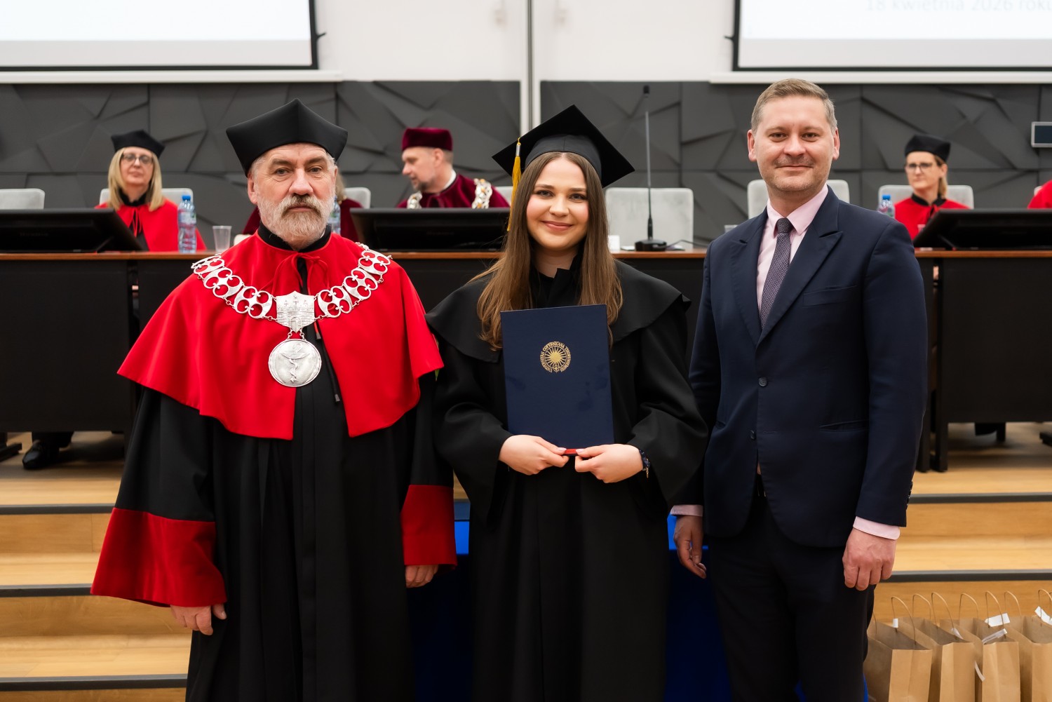W uroczystości uczestniczyli również nauczyciele akademiccy reprezentujący Wydział Farmaceutyczny: prof. dr hab. Eugenia Gospodarek-Komkowska, prof. dr hab. Dorota Olszewska-Słonina, prof. dr hab. Stefan Kruszewski, dr hab. Katarzyna Buszko, prof. UMK, dr hab. Tomasz Dziaman, prof. UMK, dr hab. Lidia Gackowska, prof. UMK, dr hab. Daniel Gackowski, prof. UMK, dr hab. Marcin Koba, prof. UMK, dr hab. Piotr Kośliński, prof. UMK, dr hab. Rafał Różalski, prof. UMK, dr Wojciech Filipiak oraz dr Łukasz Pałkowski.