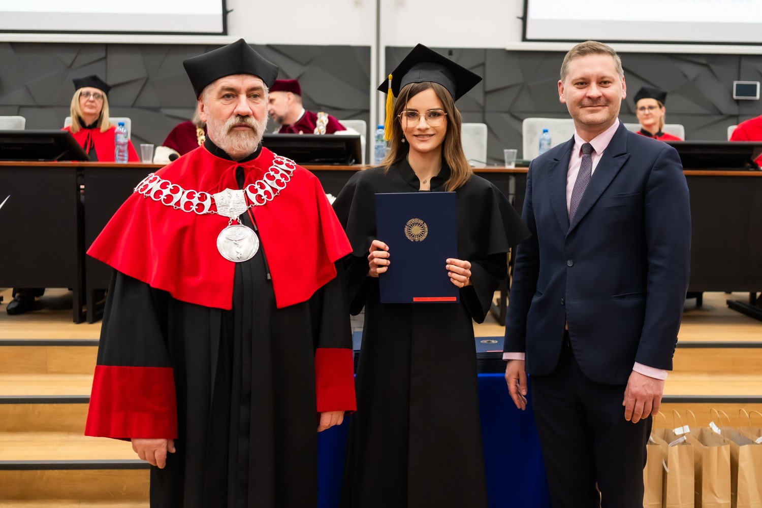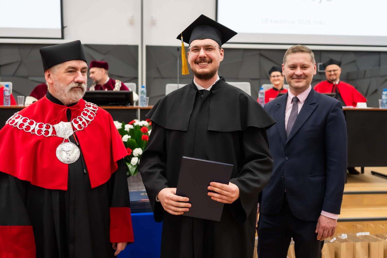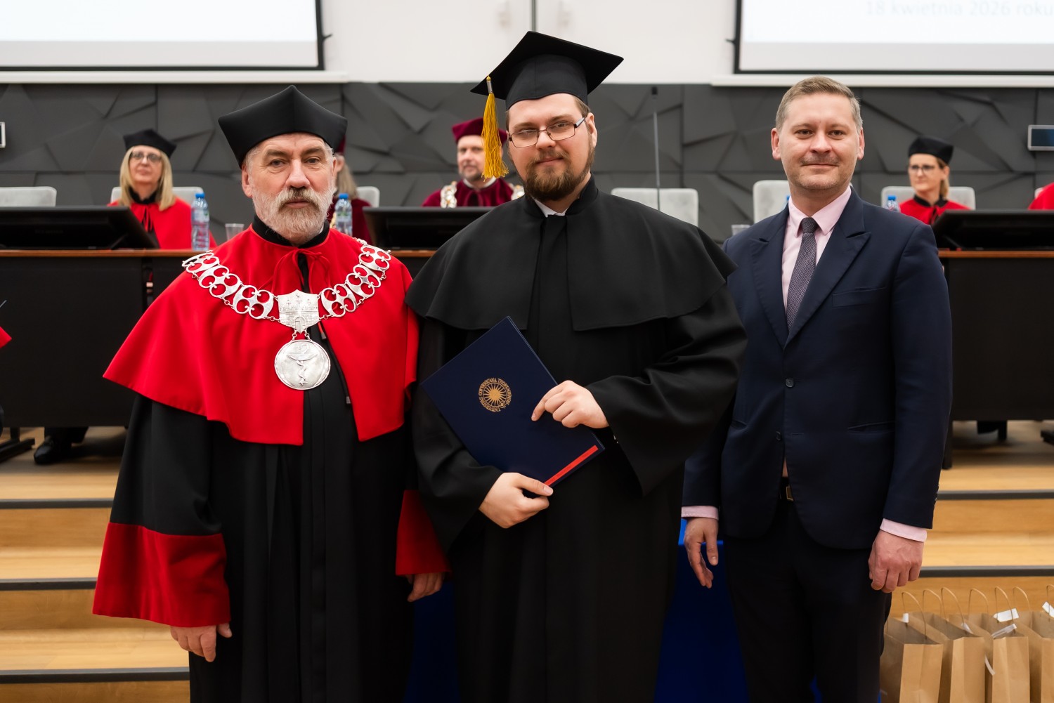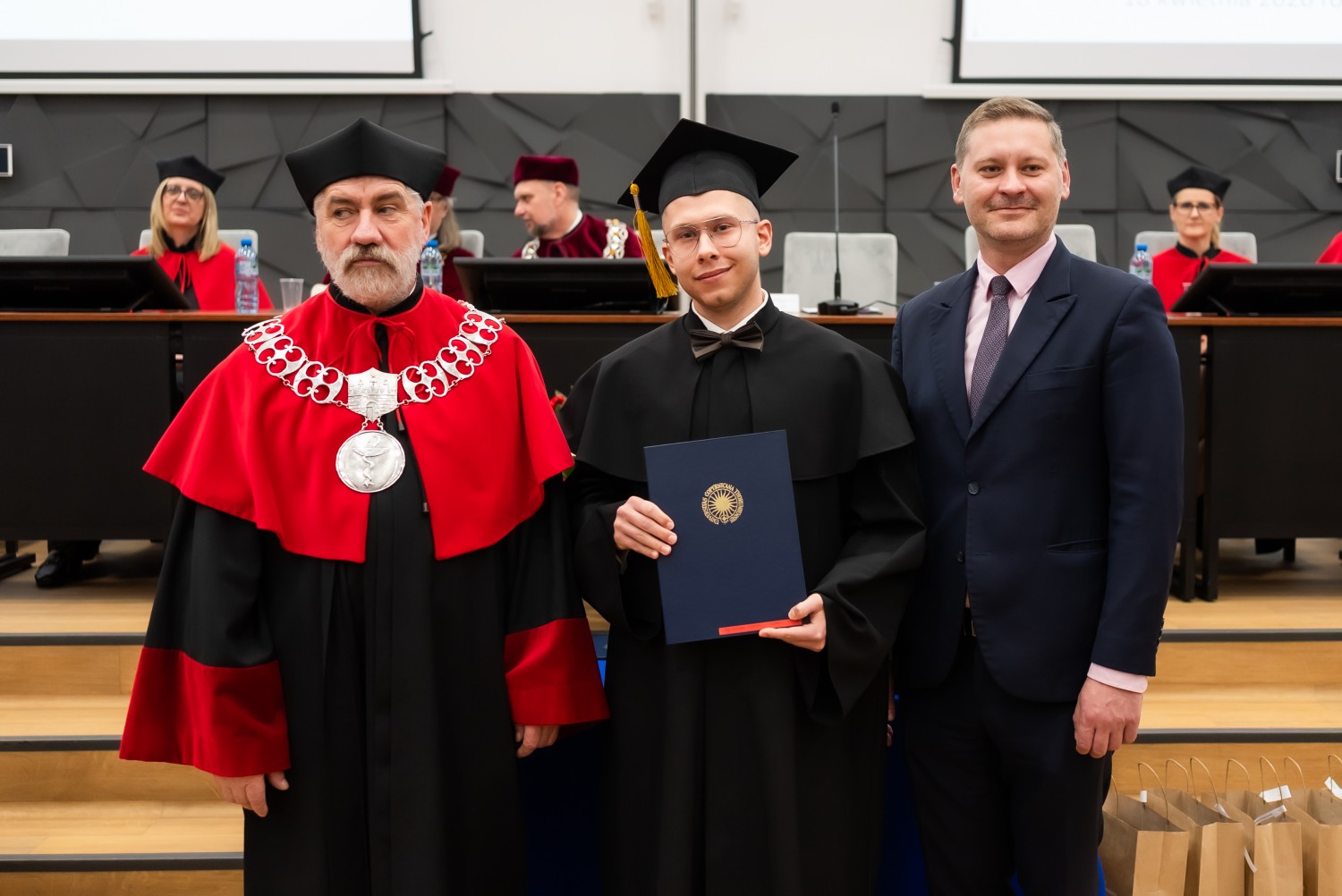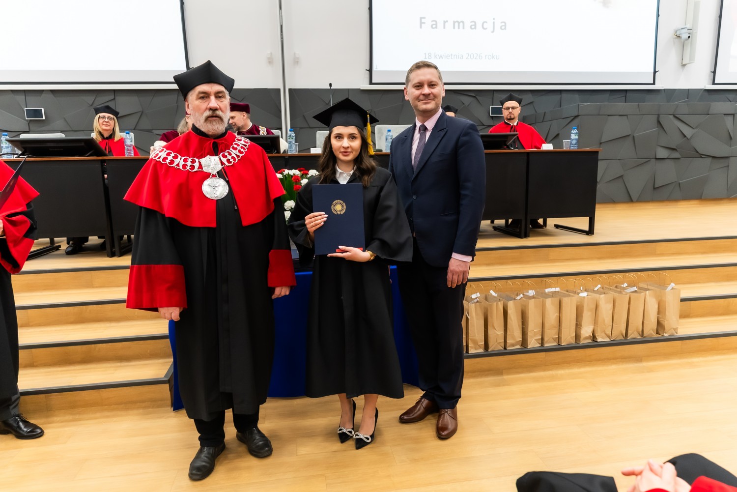 W uroczystości uczestniczyli również nauczyciele akademiccy reprezentujący Wydział Farmaceutyczny: prof. dr hab. Eugenia Gospodarek-Komkowska, prof. dr hab. Dorota Olszewska-Słonina, prof. dr hab. Stefan Kruszewski, dr hab. Katarzyna Buszko, prof. UMK, dr hab. Tomasz Dziaman, prof. UMK, dr hab. Lidia Gackowska, prof. UMK, dr hab. Daniel Gackowski, prof. UMK, dr hab. Marcin Koba, prof. UMK, dr hab. Piotr Kośliński, prof. UMK, dr hab. Rafał Różalski, prof. UMK, dr Wojciech Filipiak oraz dr Łukasz Pałkowski.