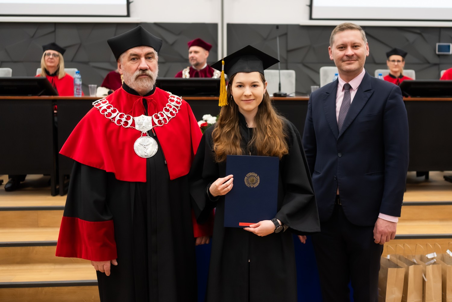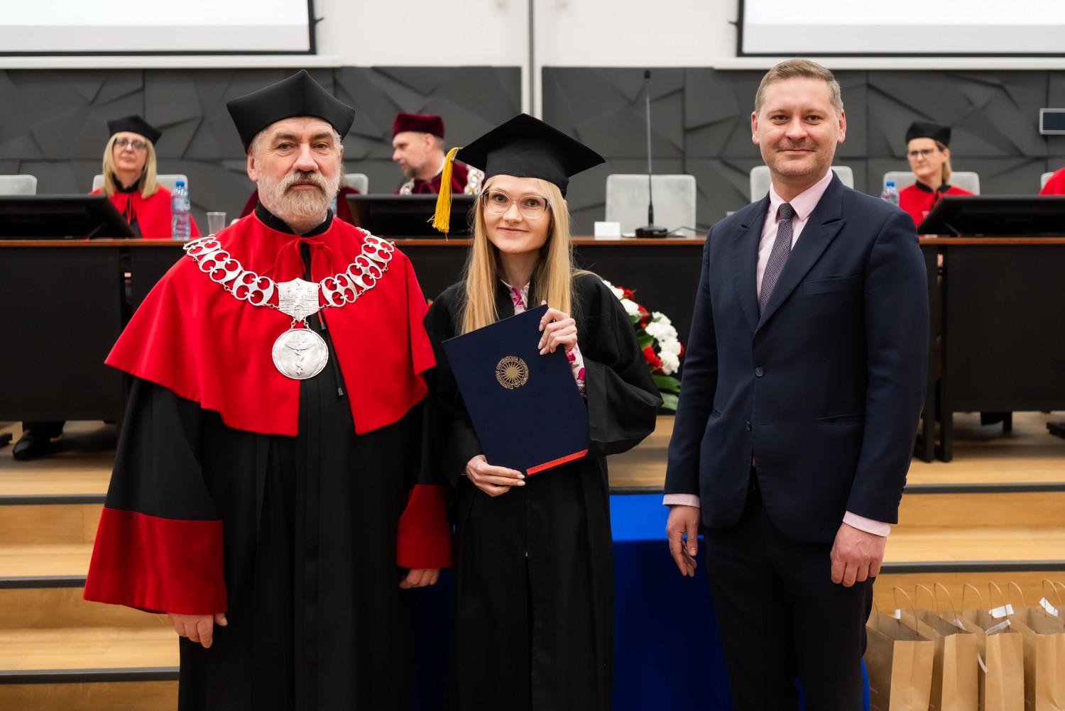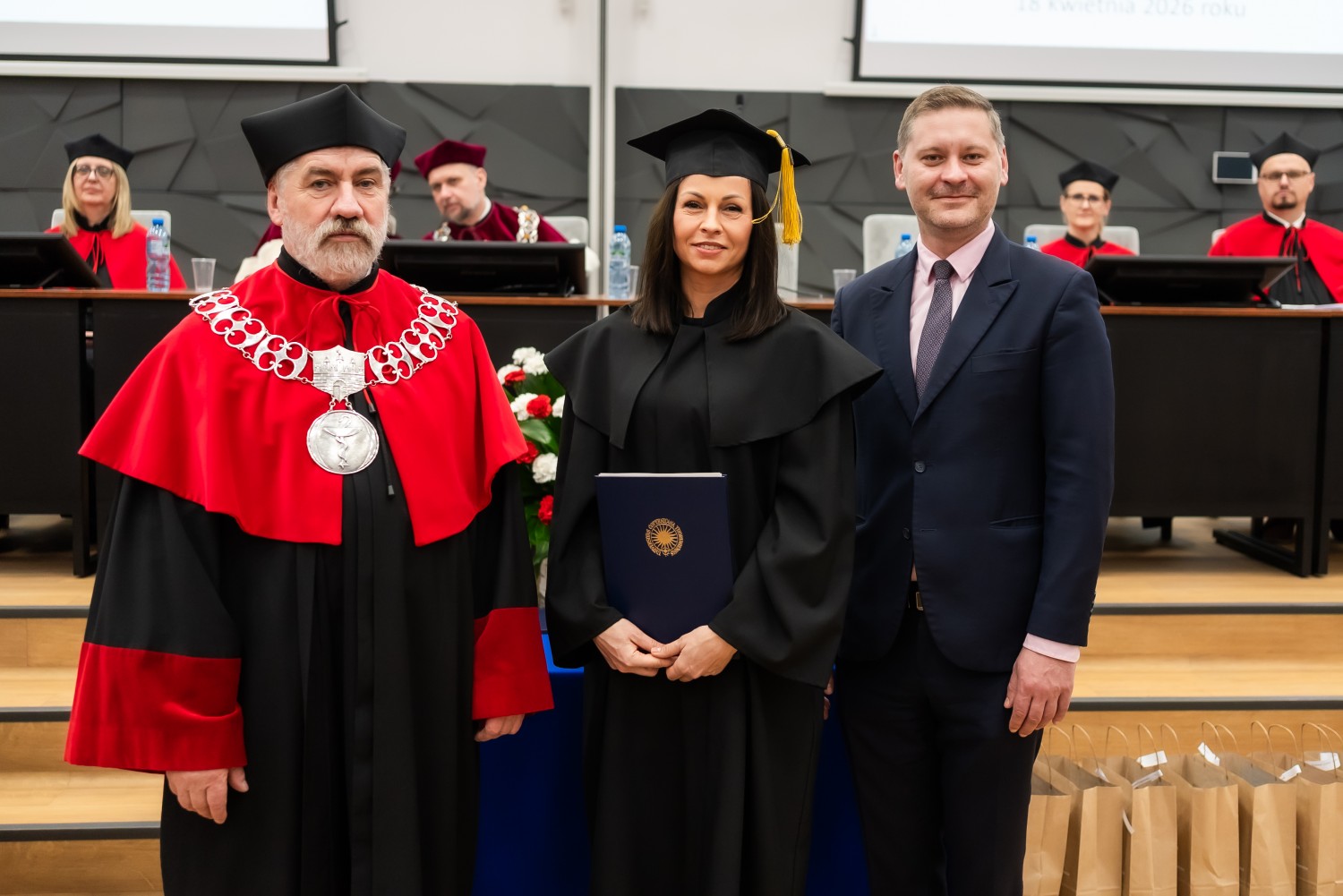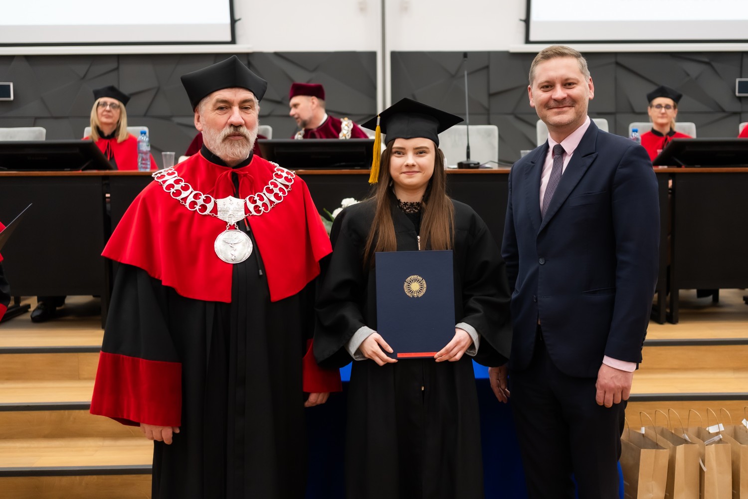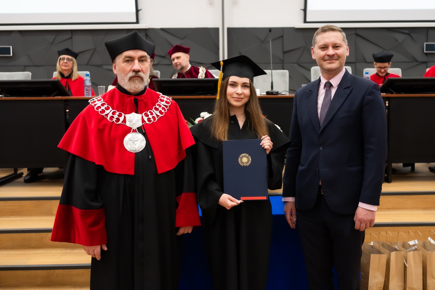 W uroczystości uczestniczyli również nauczyciele akademiccy reprezentujący Wydział Farmaceutyczny: prof. dr hab. Eugenia Gospodarek-Komkowska, prof. dr hab. Dorota Olszewska-Słonina, prof. dr hab. Stefan Kruszewski, dr hab. Katarzyna Buszko, prof. UMK, dr hab. Tomasz Dziaman, prof. UMK, dr hab. Lidia Gackowska, prof. UMK, dr hab. Daniel Gackowski, prof. UMK, dr hab. Marcin Koba, prof. UMK, dr hab. Piotr Kośliński, prof. UMK, dr hab. Rafał Różalski, prof. UMK, dr Wojciech Filipiak oraz dr Łukasz Pałkowski.