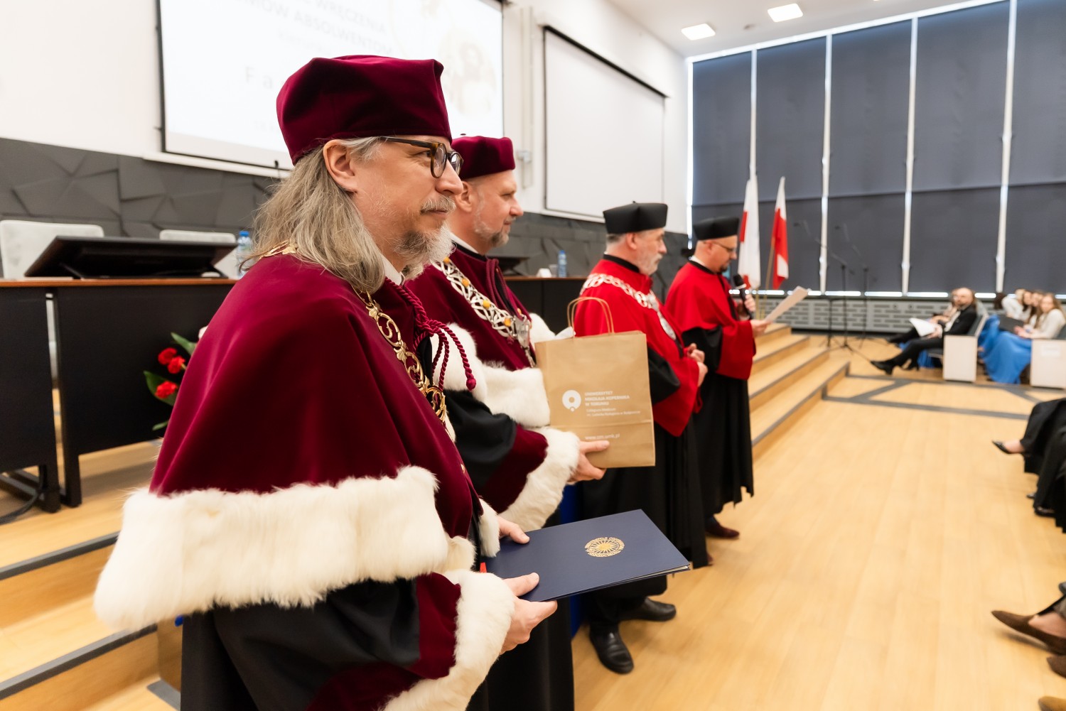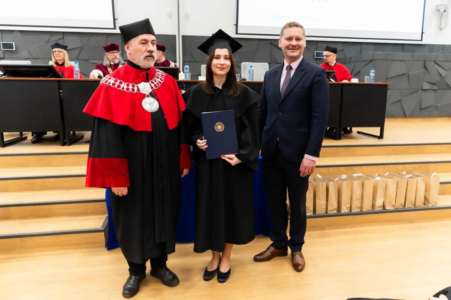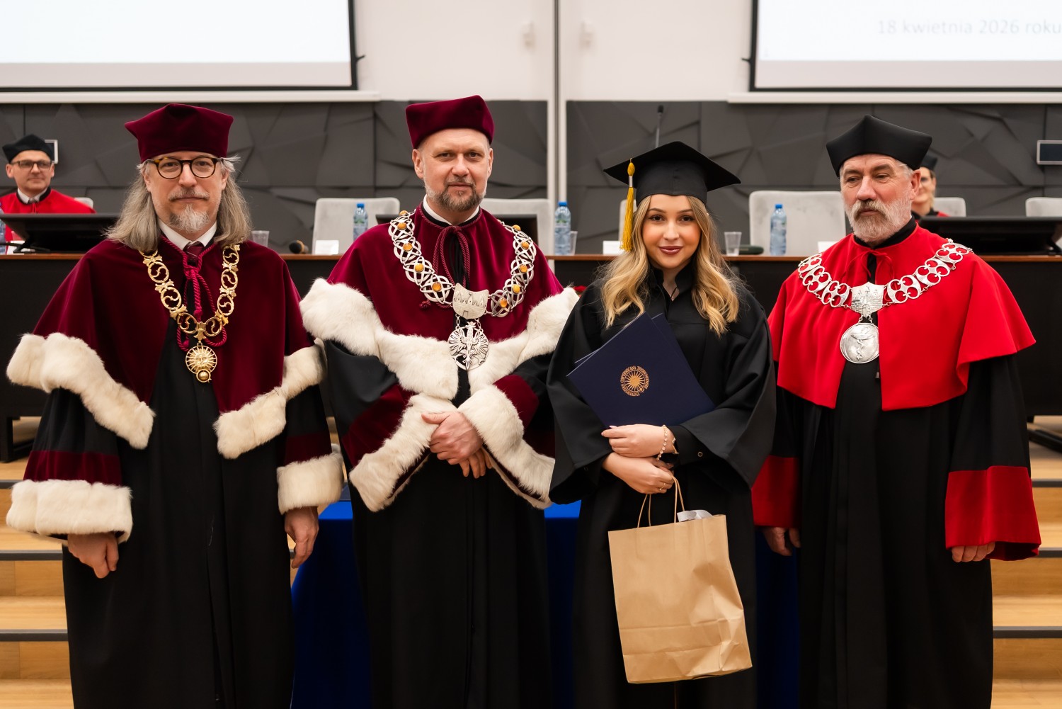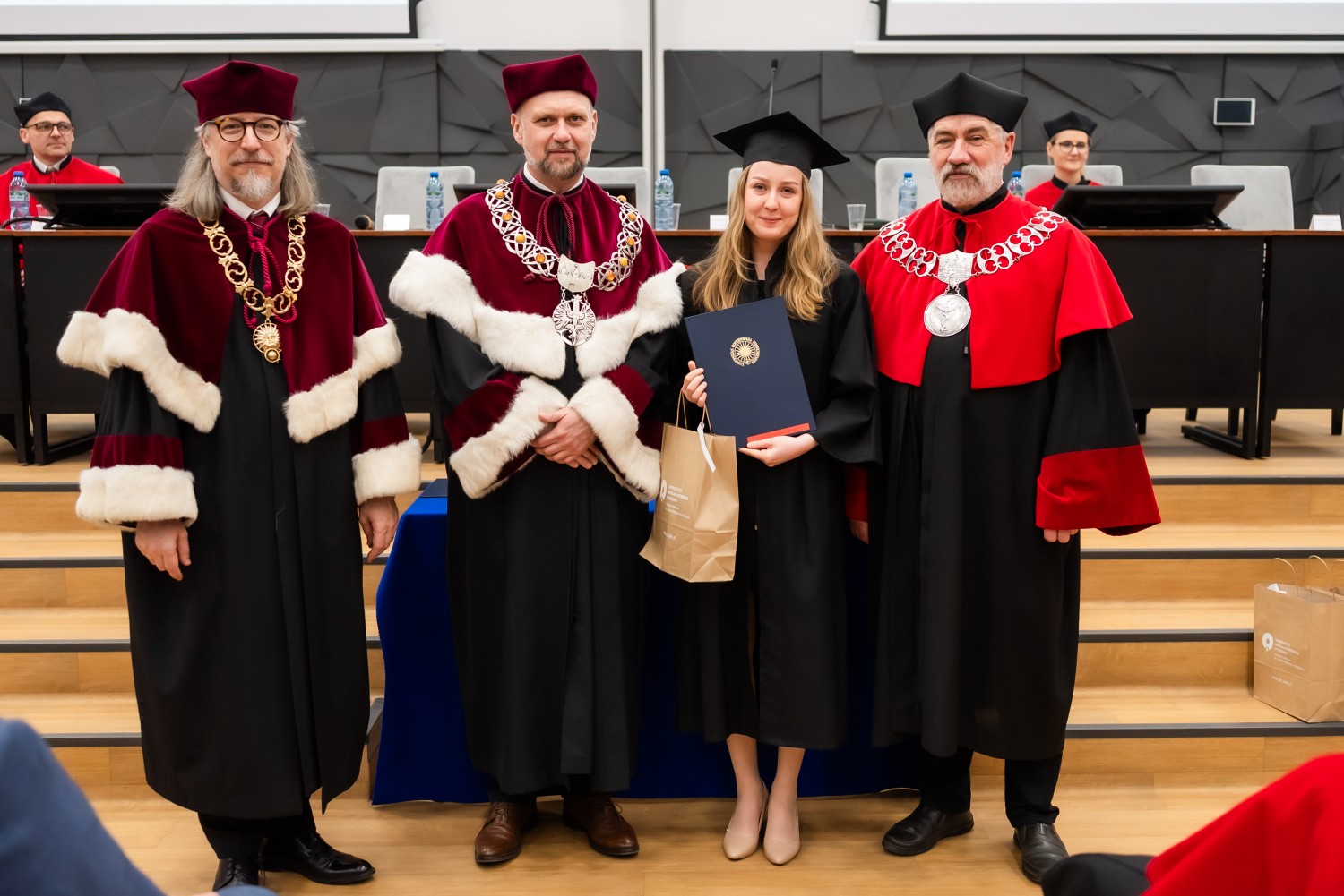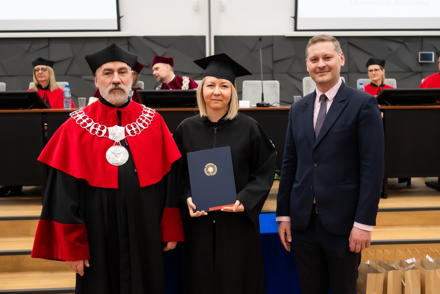 W uroczystości uczestniczyli również nauczyciele akademiccy reprezentujący Wydział Farmaceutyczny: prof. dr hab. Eugenia Gospodarek-Komkowska, prof. dr hab. Dorota Olszewska-Słonina, prof. dr hab. Stefan Kruszewski, dr hab. Katarzyna Buszko, prof. UMK, dr hab. Tomasz Dziaman, prof. UMK, dr hab. Lidia Gackowska, prof. UMK, dr hab. Daniel Gackowski, prof. UMK, dr hab. Marcin Koba, prof. UMK, dr hab. Piotr Kośliński, prof. UMK, dr hab. Rafał Różalski, prof. UMK, dr Wojciech Filipiak oraz dr Łukasz Pałkowski.