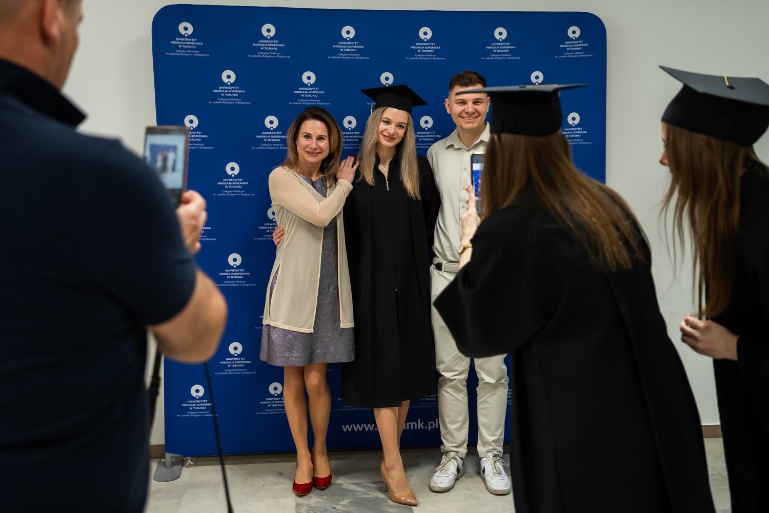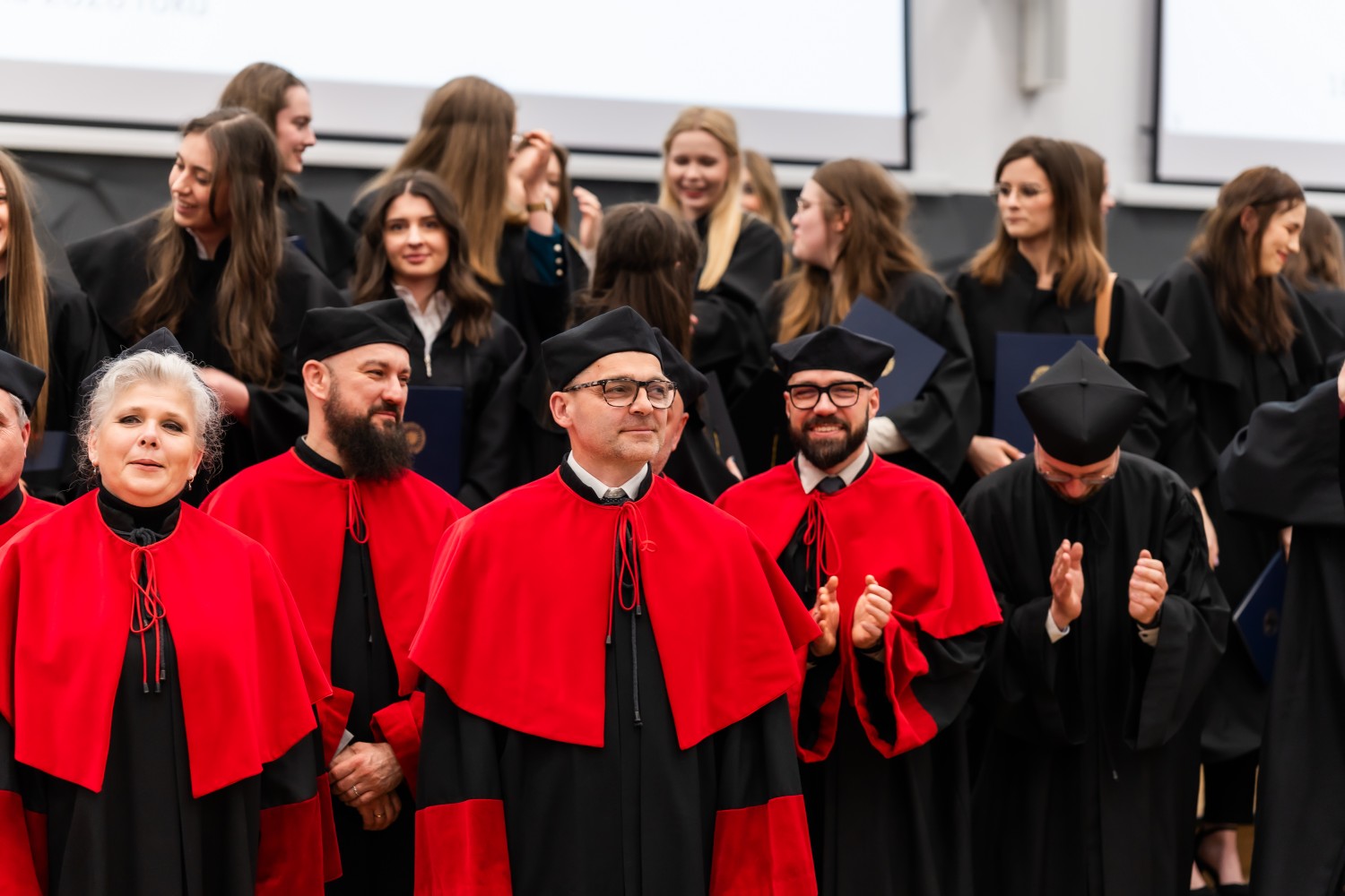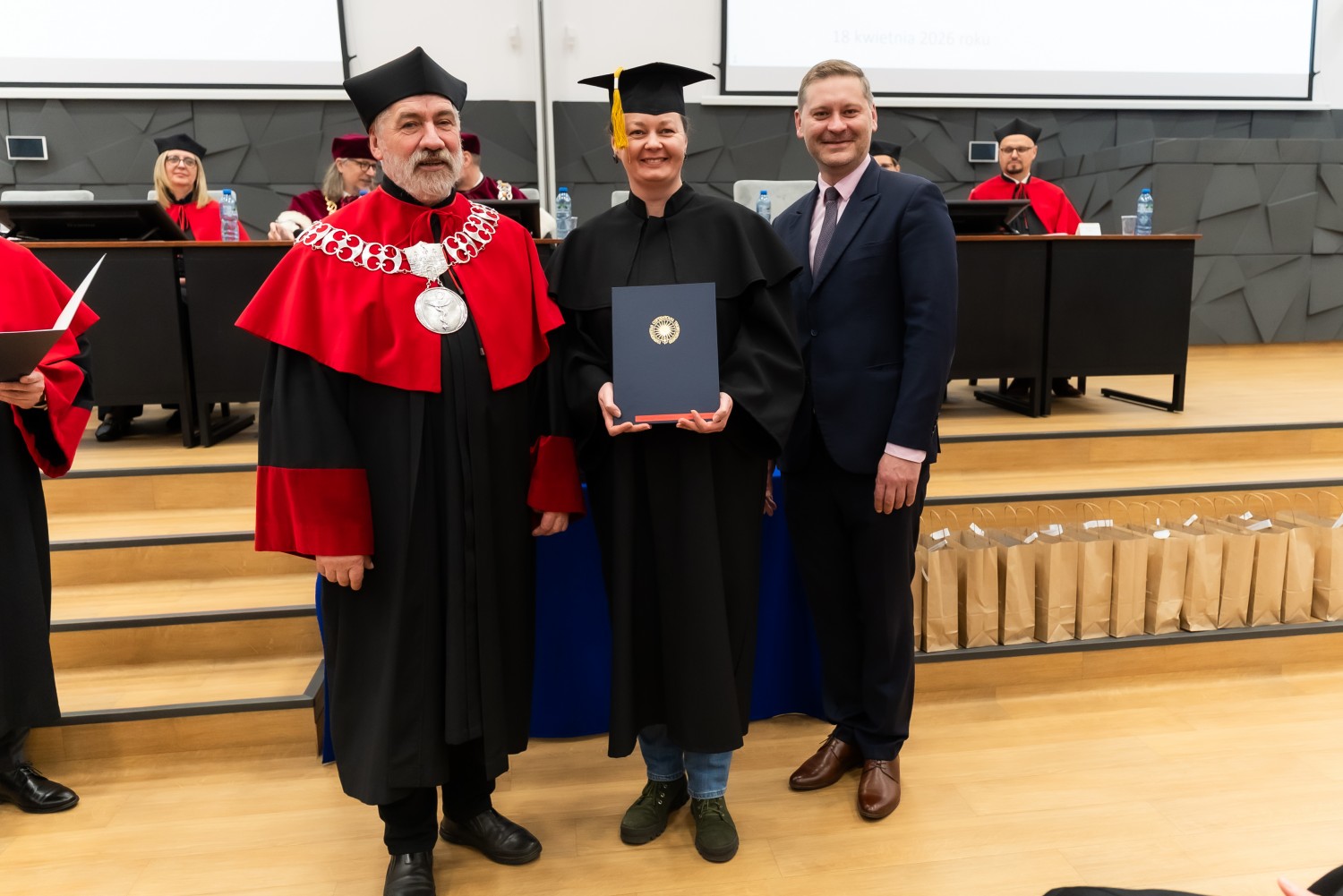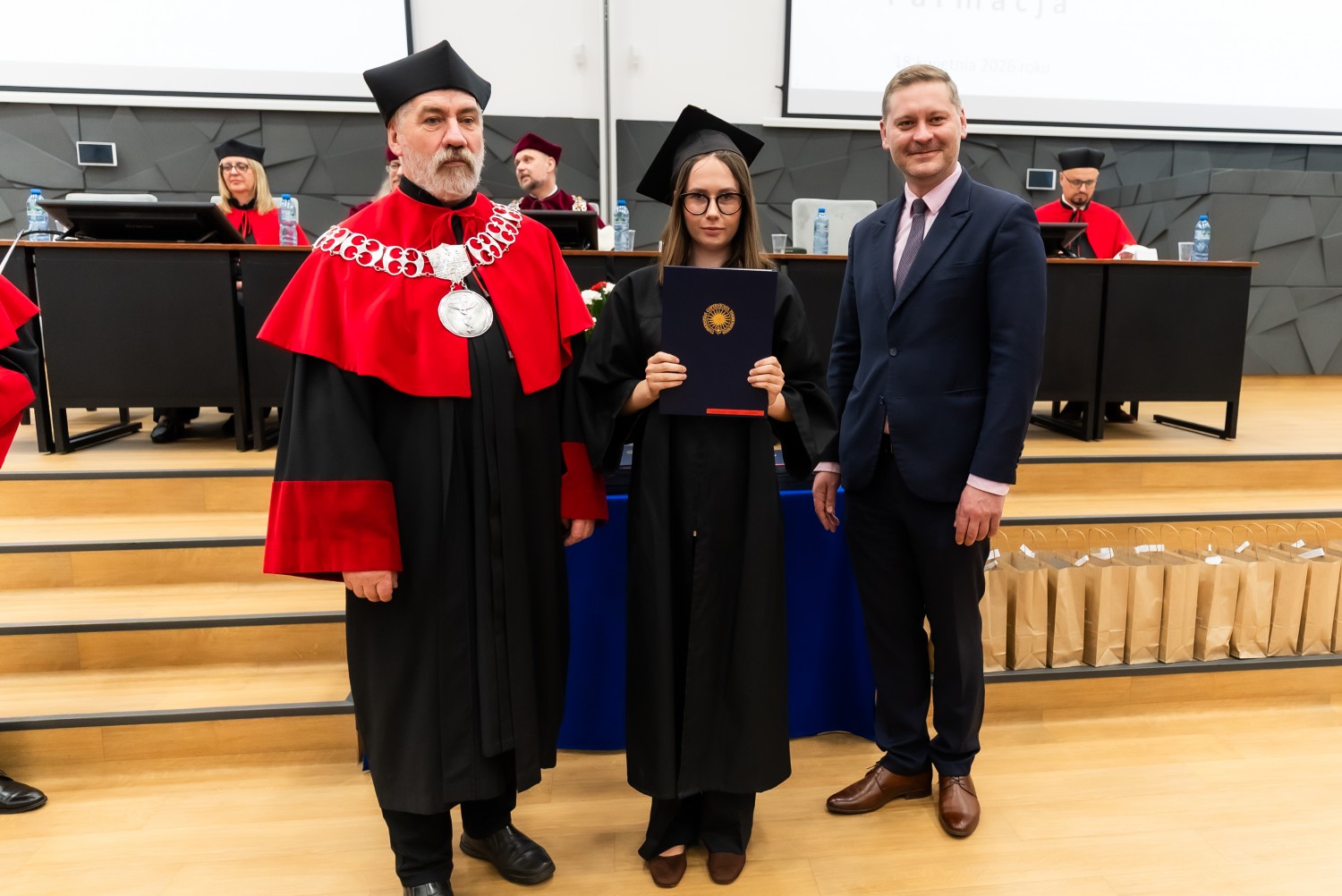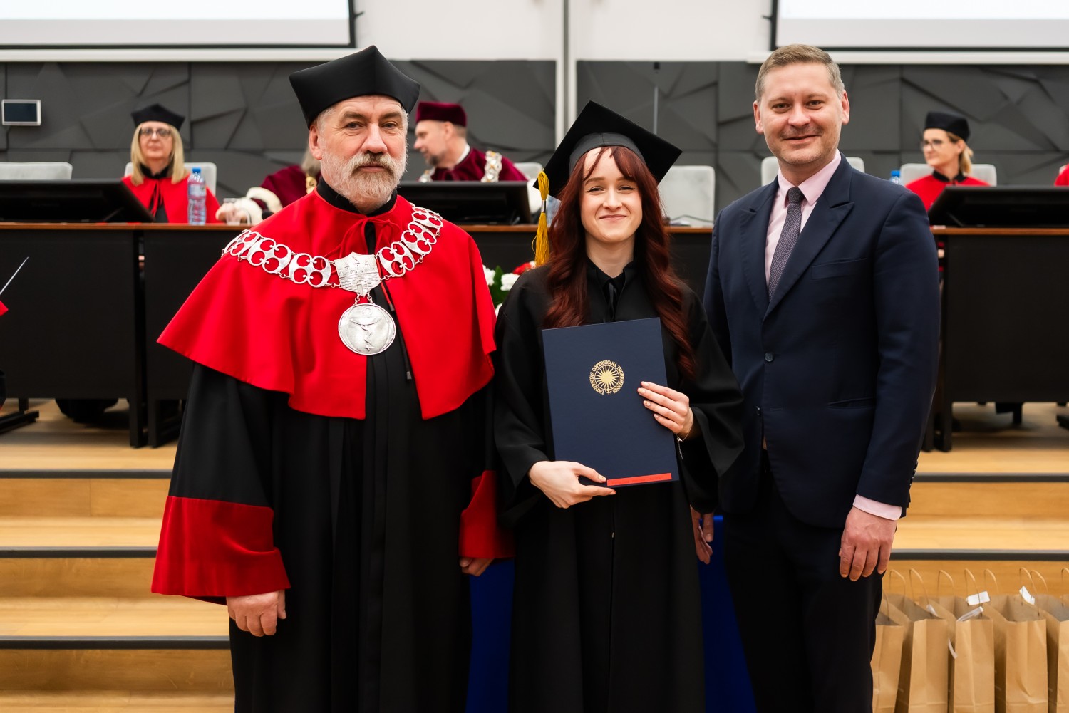 W uroczystości uczestniczyli również nauczyciele akademiccy reprezentujący Wydział Farmaceutyczny: prof. dr hab. Eugenia Gospodarek-Komkowska, prof. dr hab. Dorota Olszewska-Słonina, prof. dr hab. Stefan Kruszewski, dr hab. Katarzyna Buszko, prof. UMK, dr hab. Tomasz Dziaman, prof. UMK, dr hab. Lidia Gackowska, prof. UMK, dr hab. Daniel Gackowski, prof. UMK, dr hab. Marcin Koba, prof. UMK, dr hab. Piotr Kośliński, prof. UMK, dr hab. Rafał Różalski, prof. UMK, dr Wojciech Filipiak oraz dr Łukasz Pałkowski.