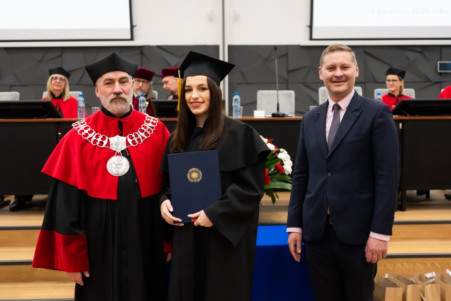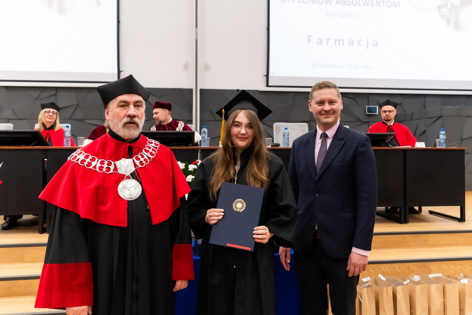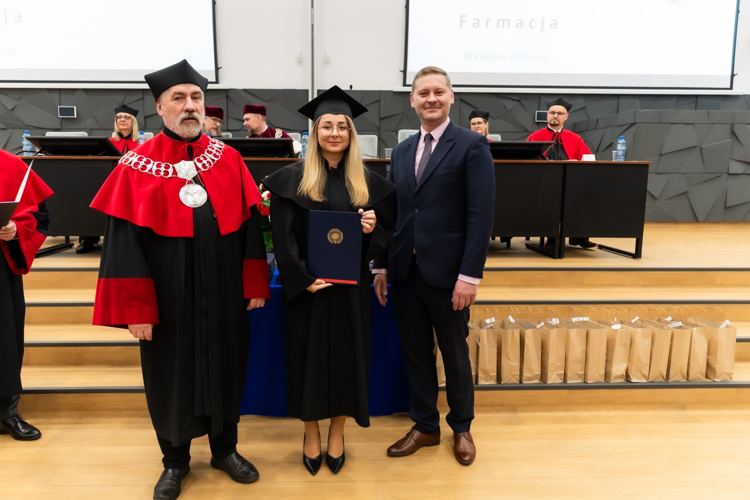 W przemówieniach gości zwracano uwagę na wyjątkowy charakter zawodu farmaceuty, łączącego wysokie kompetencje merytoryczne z odpowiedzialnością za zdrowie i bezpieczeństwo pacjentów. Podkreślano, że współczesna farmacja rozwija się bardzo dynamicznie, a postęp technologiczny, w tym wykorzystanie narzędzi sztucznej inteligencji, otwiera nowe możliwości zarówno w naukach farmaceutycznych, jak i w praktyce zawodowej. Wskazywano również na rosnące znaczenie opieki farmaceutycznej jako istotnego elementu systemu ochrony zdrowia, wspierającego pacjentów i wzmacniającego jakość opieki nad społeczeństwem.